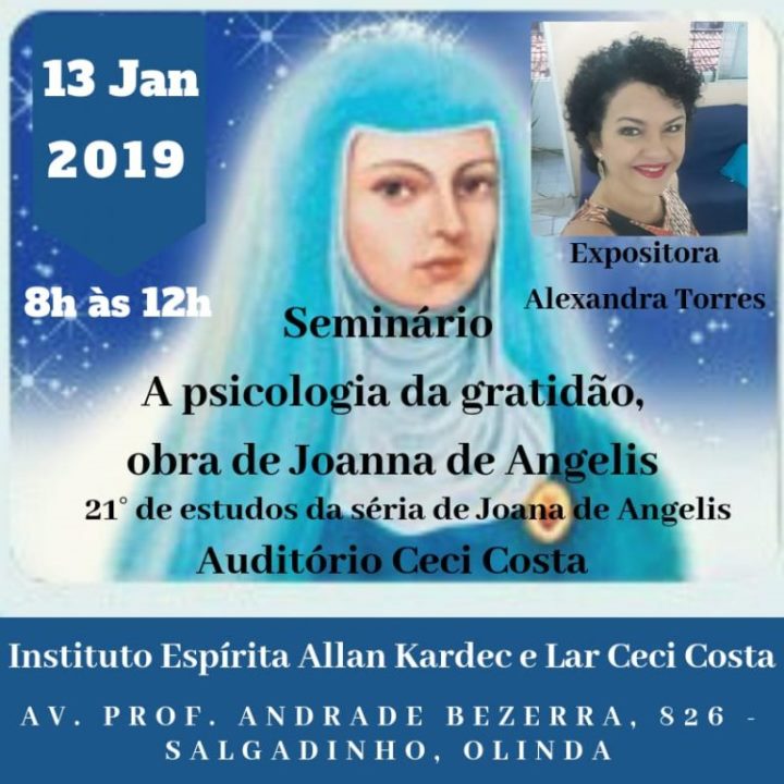 Será realizado no dia 13 de janeiro de 2019, de 8h às 12h no Auditório Ceci Costa do Instituto Espírita Allan Kardec, o Seminário “A Psicologia da Gratidão”.